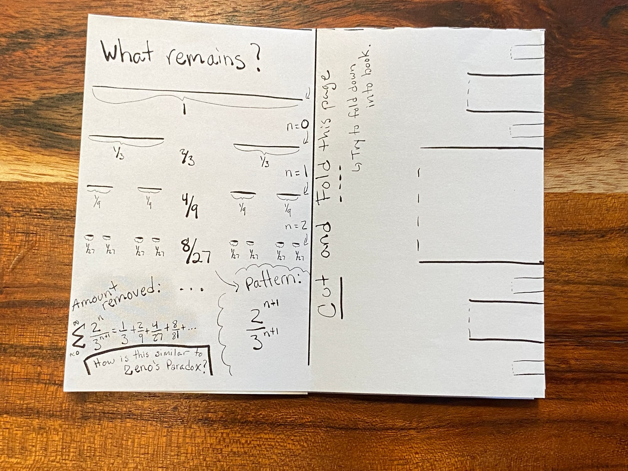 This is Fractal Kitty’s first zine! I was inspired by the public math website. Some wonderful zines from @becky_k_warren and @Ayliean are on there. After cutting the Cantor Set with Kirigami to investigate fraction operations, exponents, and patterns this week with my middle school groups I thought a zine might be fun. Fold on the lines that are solid and then cut the middle dashed line (a video is here ).