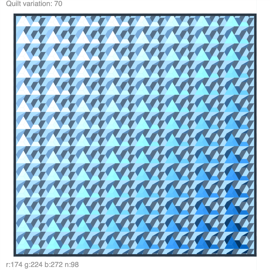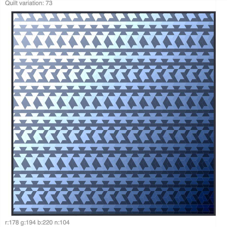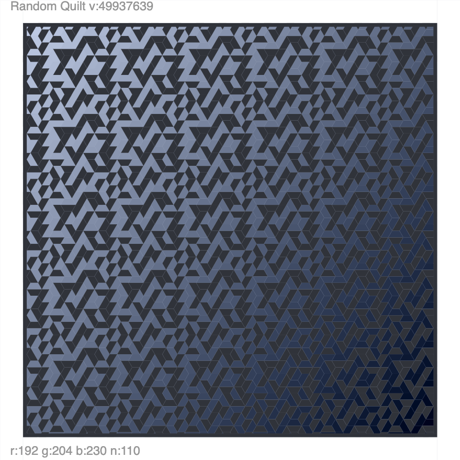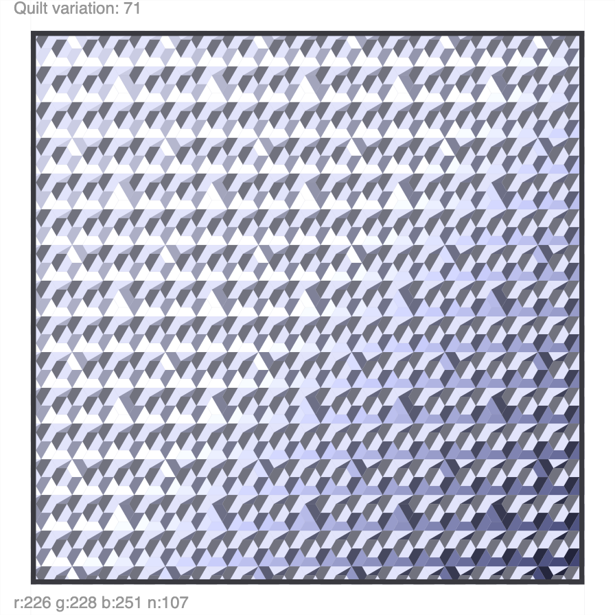 Lots of hexagonal quilt designs to play with. Press “s” to save, arrow up/down to change, and click to randomize. Click here to play with the interactive piece. A template is here.