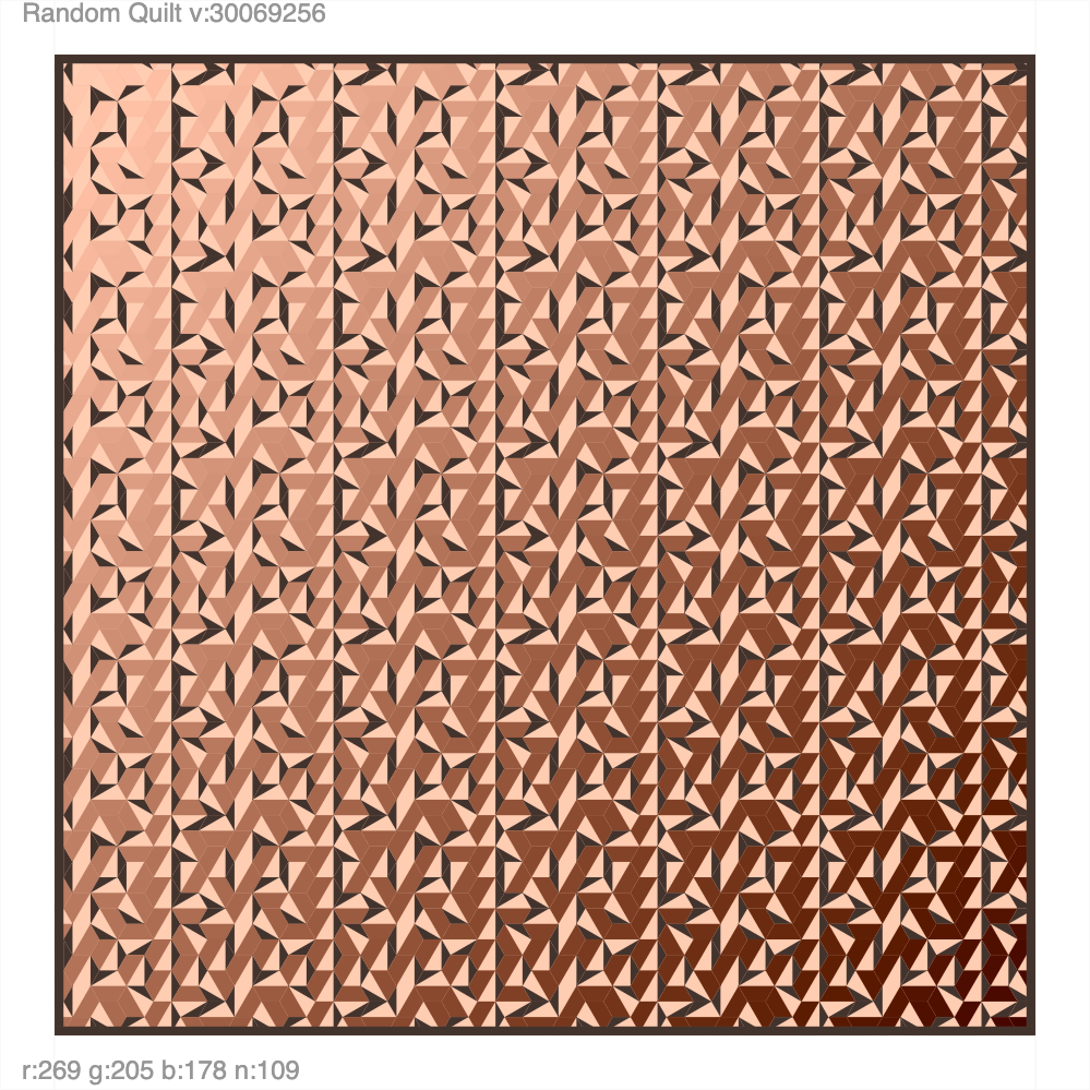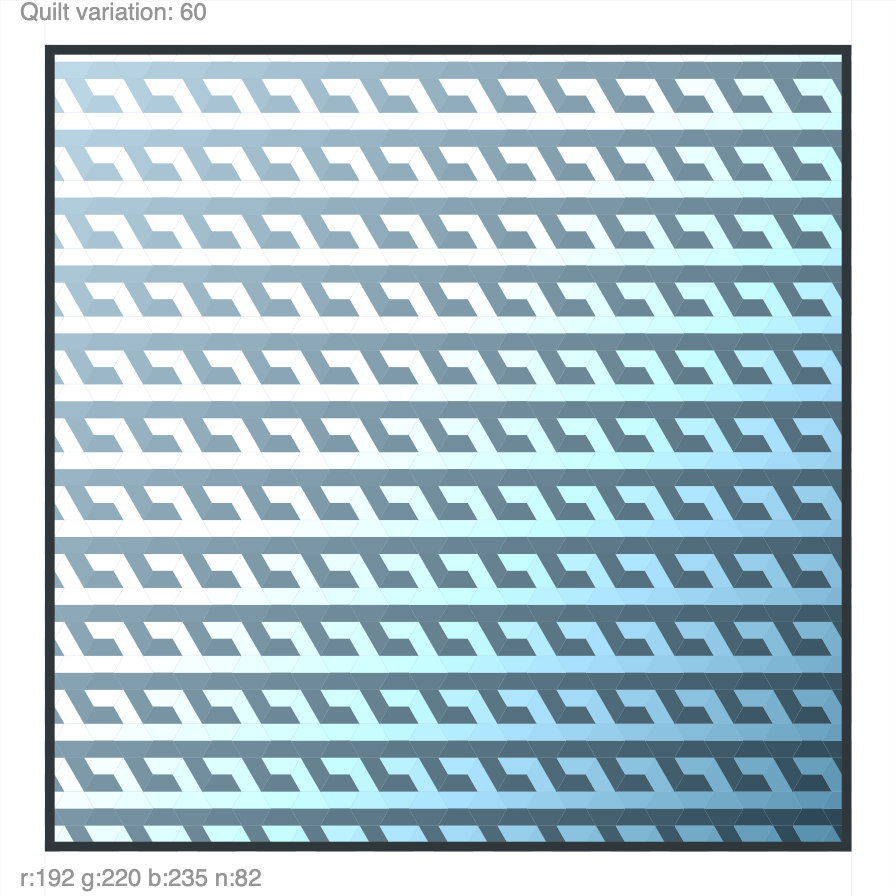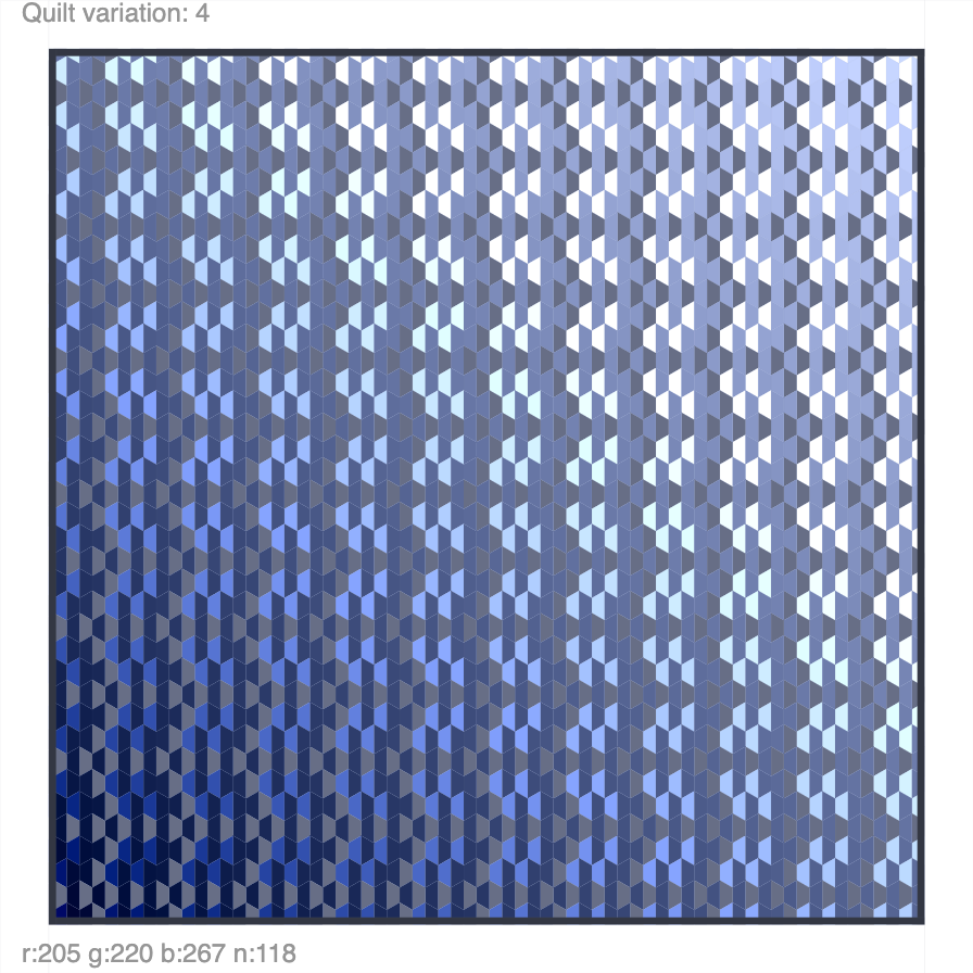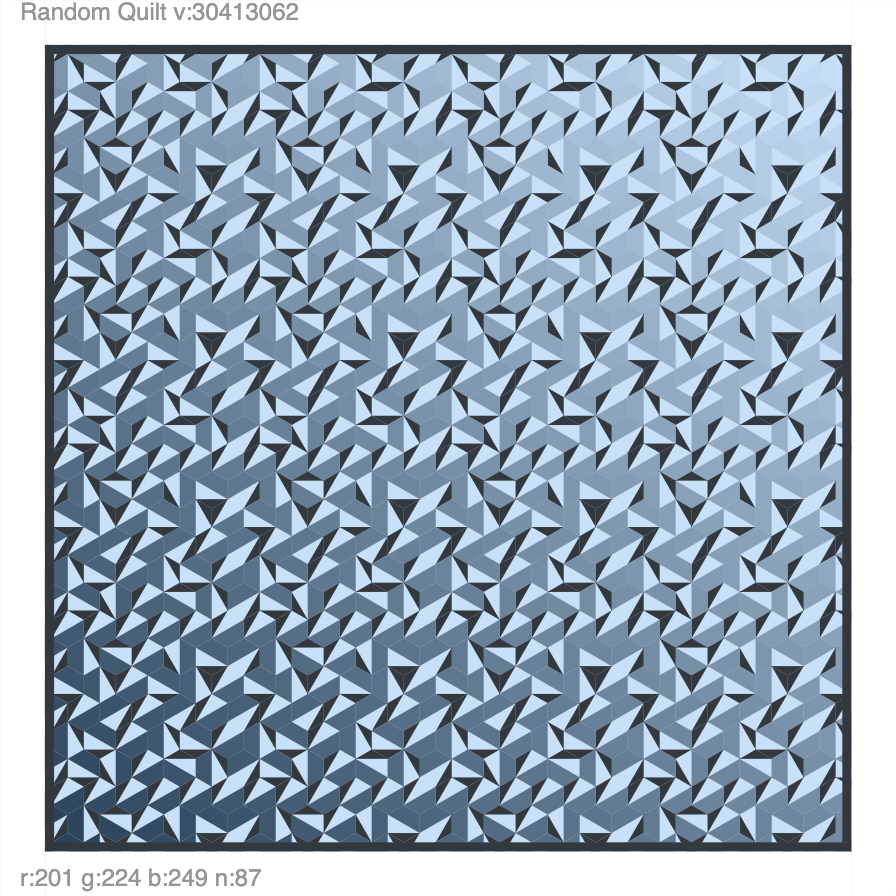 Lots of hexagonal quilt designs to play with. Press “s” to save, arrow up/down to change, and click to randomize. Click here to play with the interactive piece. A template is here.