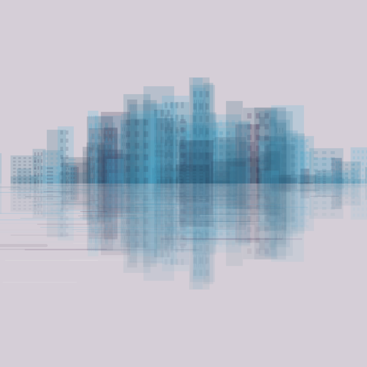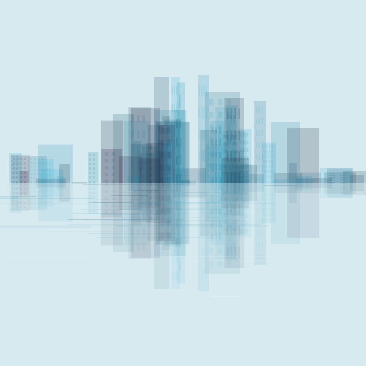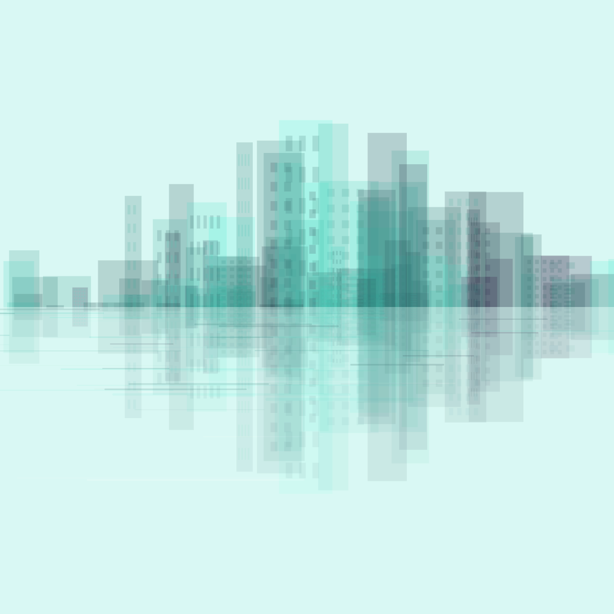 Variations of translucent cities with a reflection in water with soft muted backgrounds and blues and greens and greys for buildings with some windows.