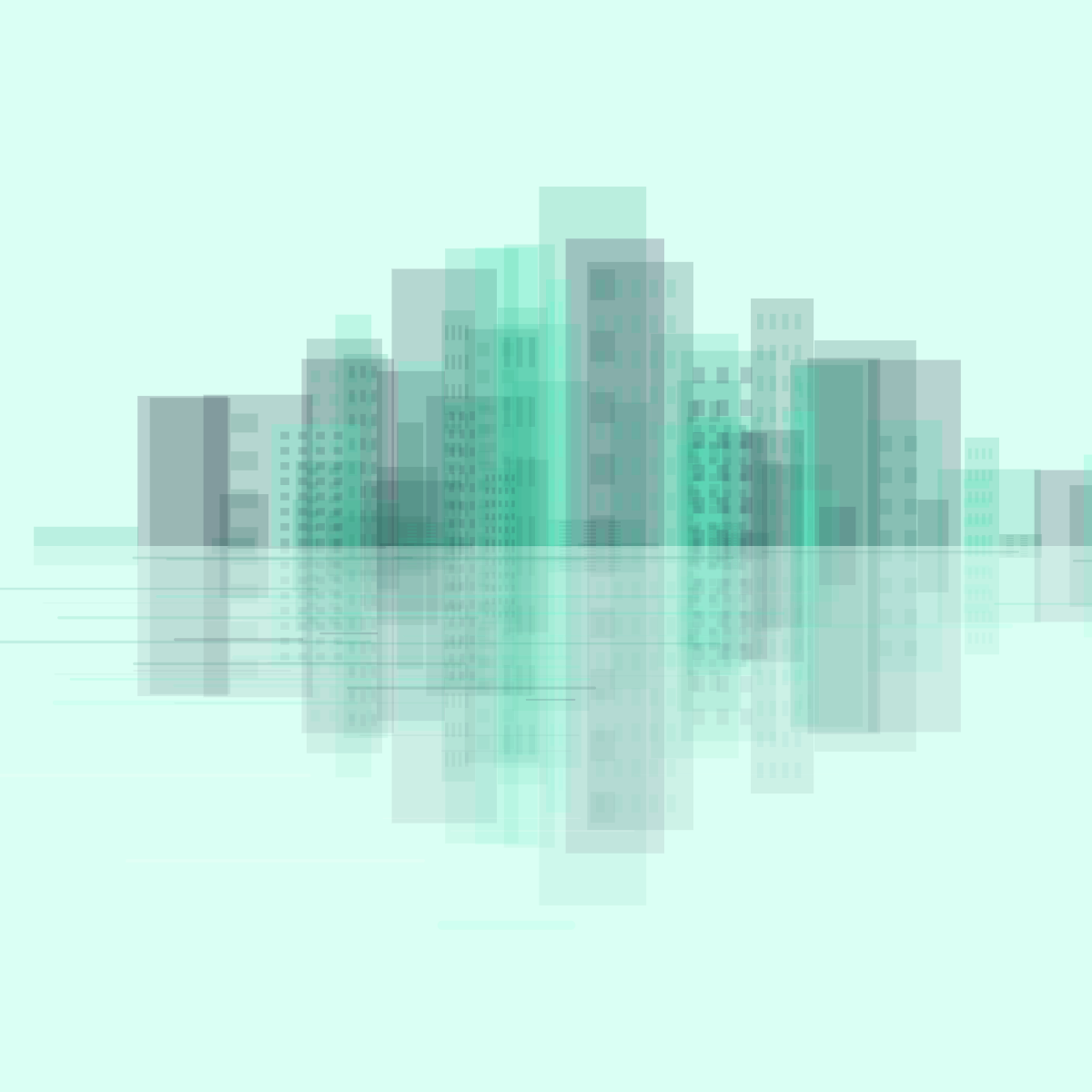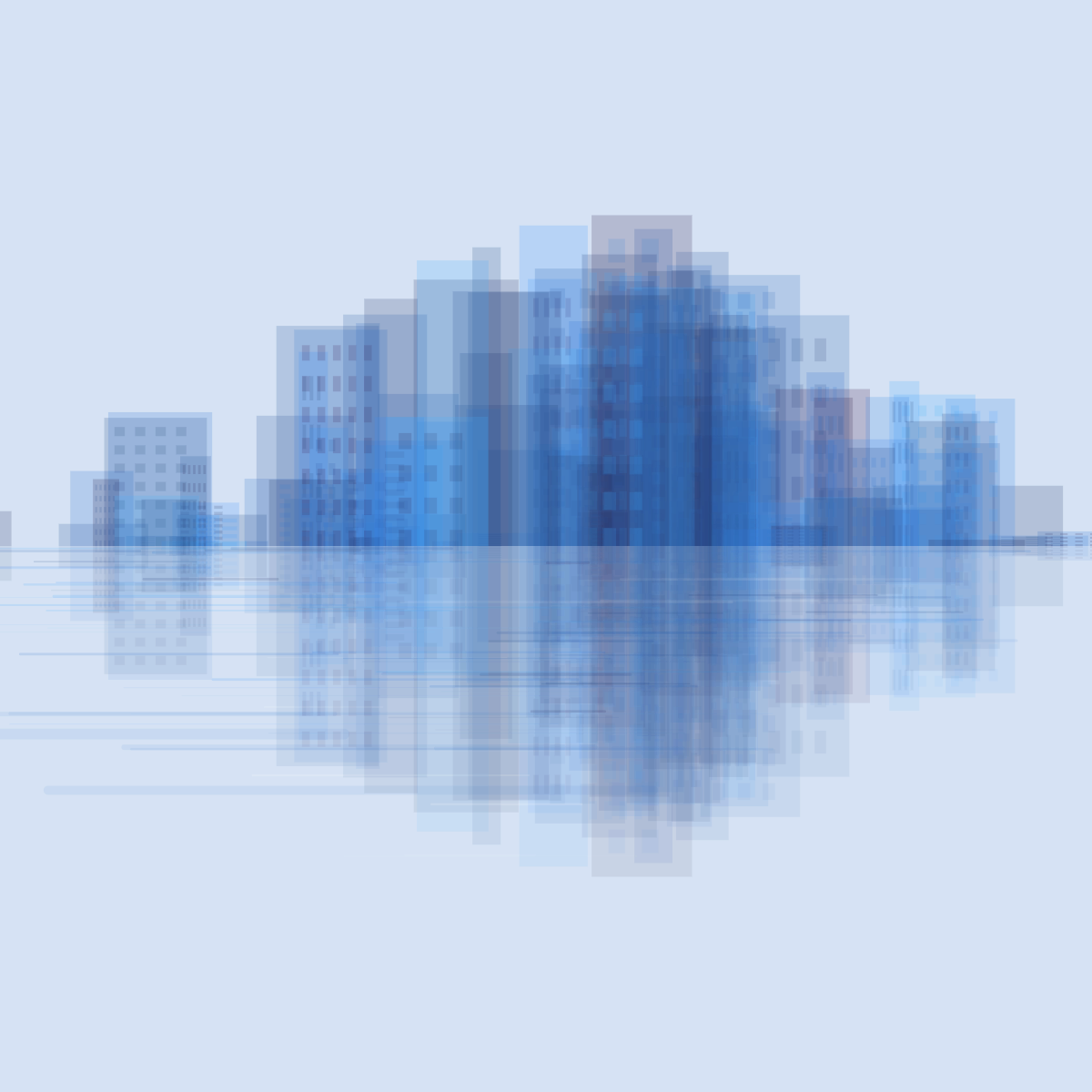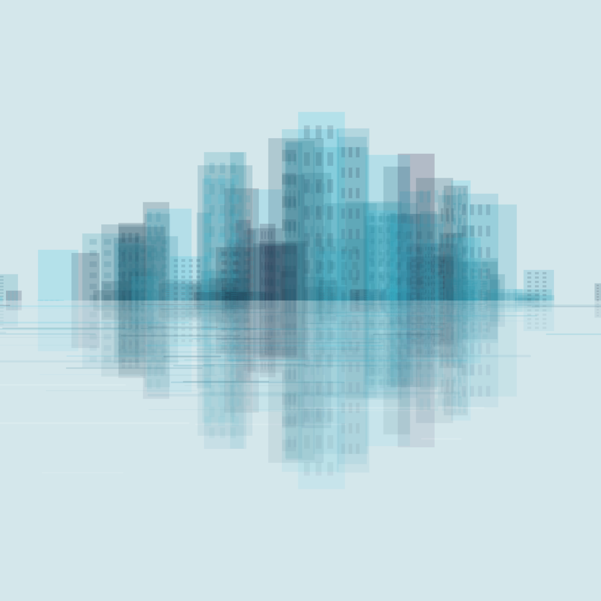 Variations of translucent cities with a reflection in water with soft muted backgrounds and blues and greens and greys for buildings with some windows.
