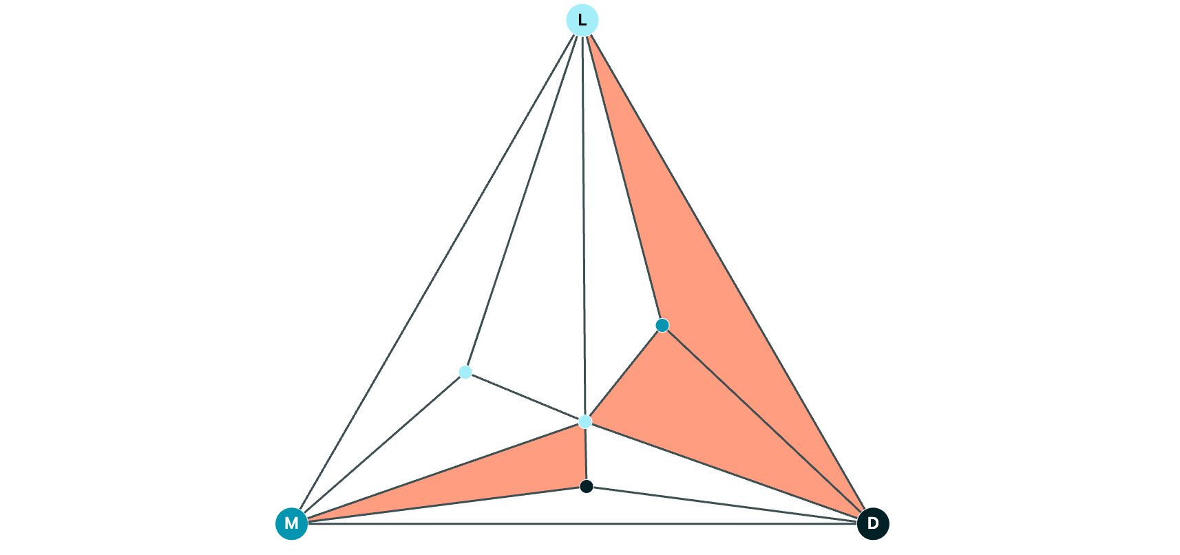 Let's add more L, M, and D points, and connect them to the vertices of their containing triangle. We'll shade the LMD triangles with color: