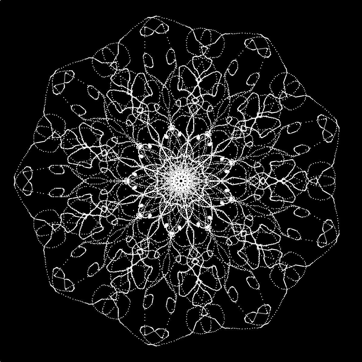 My mind was on snowflakes tonight, which brought me down a rabbit hole of reflections, lace, and play. The code here is simple but fun. Enjoy making snowflakes, lace, stars, or whatever comes to mind. If you wish to fork the code or play it is here. My CodePen is below. Press the spacebar (or any key) to reset the canvas.