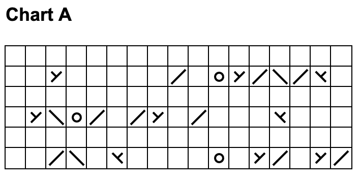 - Make the pattern by shuffling the list of stitches and adding a knit-only row between each shuffle until the Chart A has the right number of rows