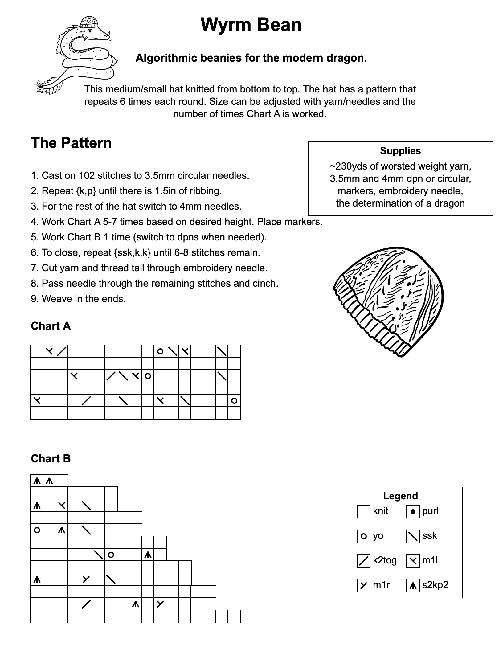 If you knit, patterns are at wyrmbean.com. There you will be able to randomize and download a knitting pattern. Knit at your own risk - these patterns are experimental. I'd love to see pictures if you make one.