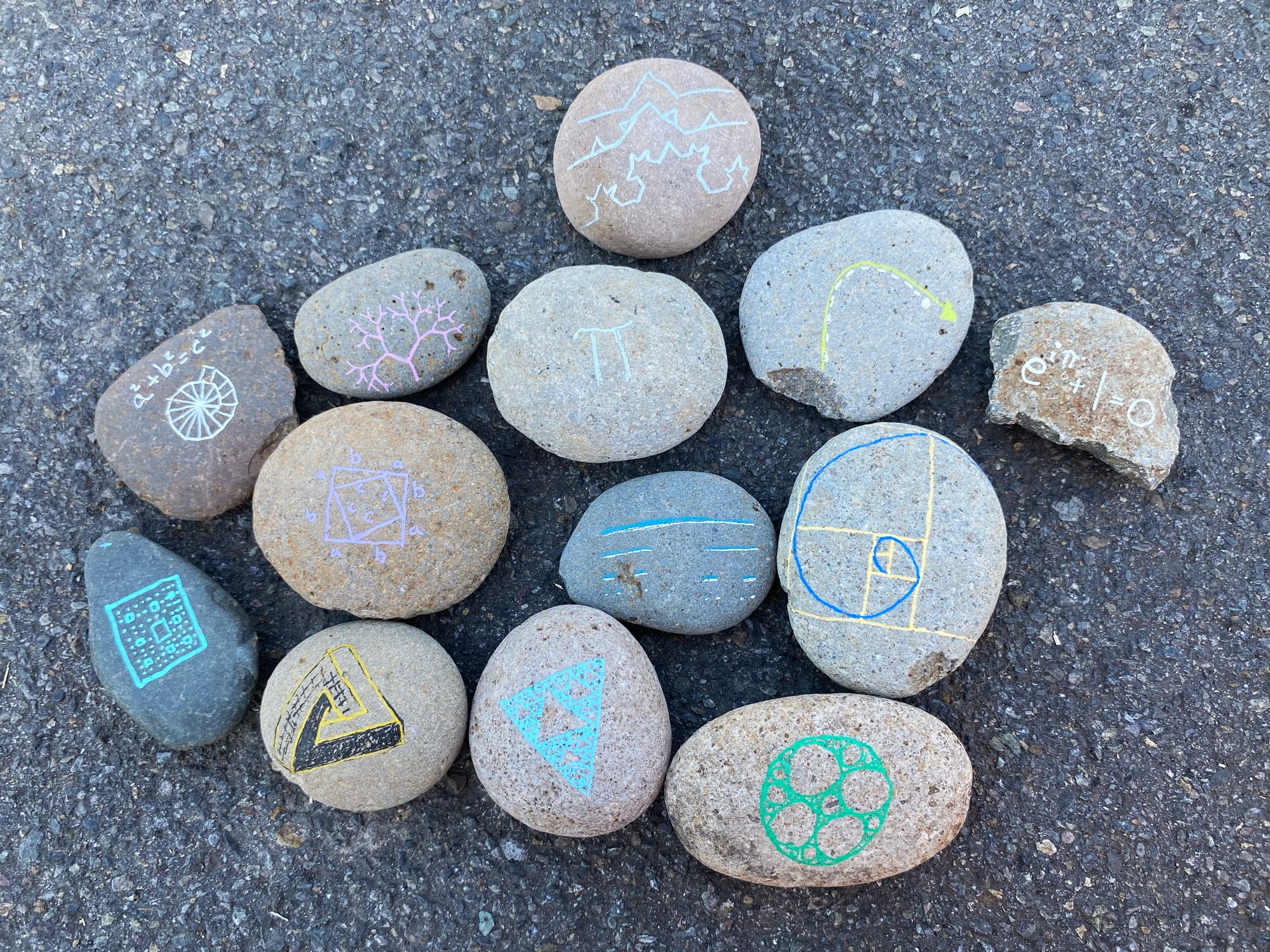 For week 52 of 52 Weeks of Hands-On Math, I couldn’t resist a play on words: Math rocks! This week I encourage learners to share their math in the neighborhood. Create sidewalk chalk art with Fibonacci hopscotch, paint a math rock garden, make a math obstacle course by your home, or have a piece of outside artwork to share.